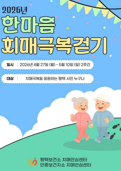 한방통신사 신유철기자 기자 | 평택보건소 치매안심센터와 안중보건지소 치매안심센터에서는 지역 주민의 치매 예방과 인식개선을 위해 녪년 한마음 치매극복 걷기 행사’를 오는 4월 27일부터 5월 10일까지 2주간 진행한다.