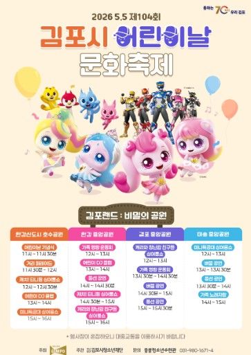 ‘상상과 현실이 만나는 특별한 공간 비밀의 공원 김포랜드’를 주제로 한 이번 축제는 오전 10시 30분부터 오후 4시까지 운영되며, 총 83개의 체험부스와 대형 에어바운스 놀이기구, 김포 시민 25가족이 참여하는 대규모 거리 퍼레이드, 캐릭터 싱어롱쇼 등이 펼쳐질 예정이다.