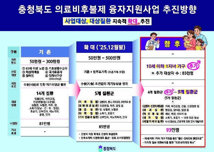 충청북도는 여기에서 더 나아가 지원 대상을 10세 이하 자녀를 둔 한 자녀 가정까지 확대하고, 신경과·외과·피부과·재활의학과 등 4개 질환군을 추가해 기존 5개 질환군에서 총 9개 질환군으로 확대할 계획이다. 이를 통해 보다 촘촘하고 빈틈없는 지원체계를 구축한다는 방침이다.