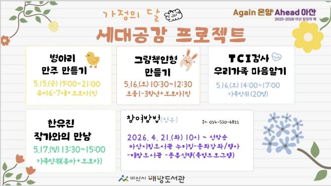 한방통신사 신태공 기자 | 아산시 배방도서관이 5월 가정의 달을 맞아 가족 간 소통과 유대감 강화를 위한 ‘세대공감 프로젝트’를 운영한다.