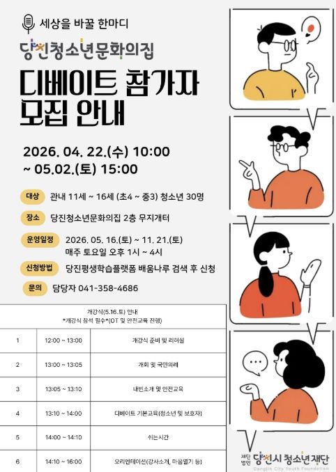 한방통신사 신태공 기자 | (재)당진시청소년재단 당진청소년문화의집에서는 5월 16일부터 11월 21일까지 매주 토요일마다 총 23회기에 걸쳐 관내 청소년(11세~16세) 30명을 대상으로 디베이트 프로그램이 진행될 예정이다.