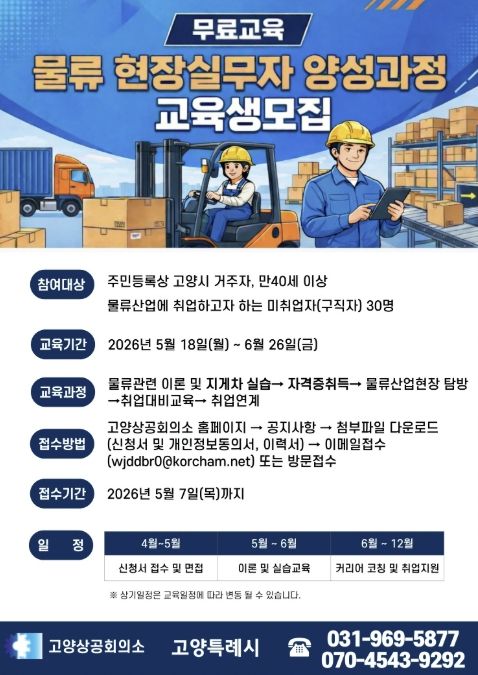 한방통신사 신유철기자 기자 | 고양특례시는 2026년 고양맞춤형 일자리학교 공모에 선정된 ‘물류 현장실무자 양성과정’에 참여할 교육생을 오는 5월 7일까지 모집한다.