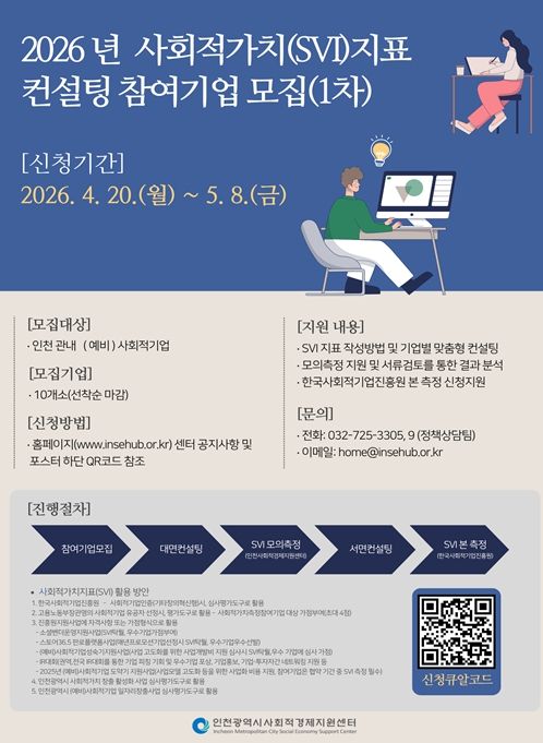 한방통신사 신유철기자 기자 | 인천광역시는 관내 사회적경제기업의 지속가능한 성장과 사회적 가치 창출 역량 강화를 위해 ‘2026년 사회적가치지표(SVI) 컨설팅(1차)’ 참여기업을 모집한다고 밝혔다.