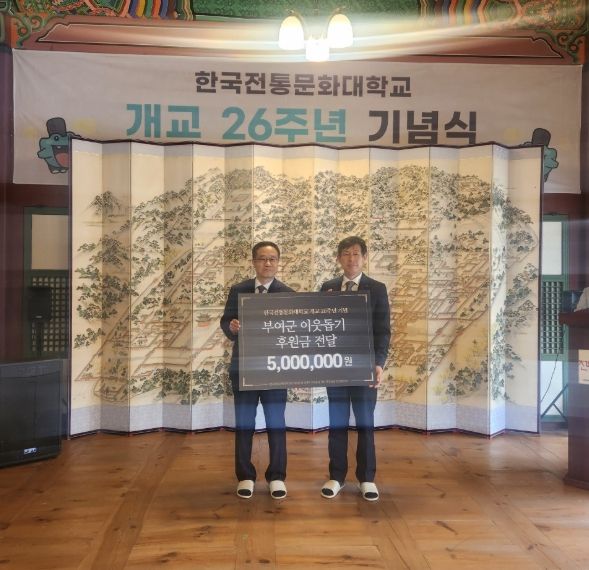 한방통신사 신태공 기자 | 한국전통문화대학교 교직원일동은 개교 26주년 기념행사에서 저소득 가구의 초·중·고 학생 장학금으로 사용해 달라며 이웃돕기 성금 500만 원을 부여군에 기탁했다고 22일 밝혔다.