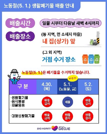 거제시는 5월 1일 노동절에는 자원순환시설을 운영하지 않으며, 생활폐기물 수집·운반 대행업체 근로자의 휴무가 시행됨에 따라 일반생활·음식·재활용품·대형생활폐기물이 수거되지 않는다고 밝혔다.