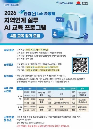한방통신사 양호선기자 기자 | 동해시와 한림대학교(총장 최양희)는 동해시 청소년센터와 북평산업단지 복합문화센터에서 공공행정 및 지역 산업체 종사자를 대상으로 직무 특성에 맞춘'한림 G-Lab@동해 지역 연계 실무형 AI 교육 프로그램'을 운영한다고 밝혔다.