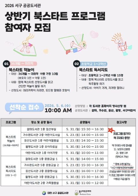한방통신사 신태공 기자 | 대전 서구 5개 공공도서관(갈마·가수원·둔산·월평·어린이)은 영유아와 어린이들의 건강한 독서 습관 형성을 돕기 위해 2026년 상반기 ‘북스타트 프로그램’을 운영한다.