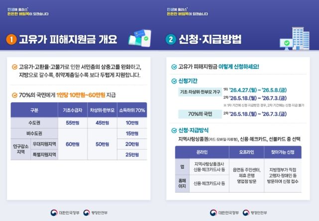1차 신청은 4월 27일부터 5월 8일까지 기초생활수급자 및 차상위계층·한부모가족을 대상으로 진행되며 2차 신청은 5월 18일부터 7월 3일까지 소득 하위 70% 일반 군민과 1차에 신청하지 못한 취약계층이 대상이다.