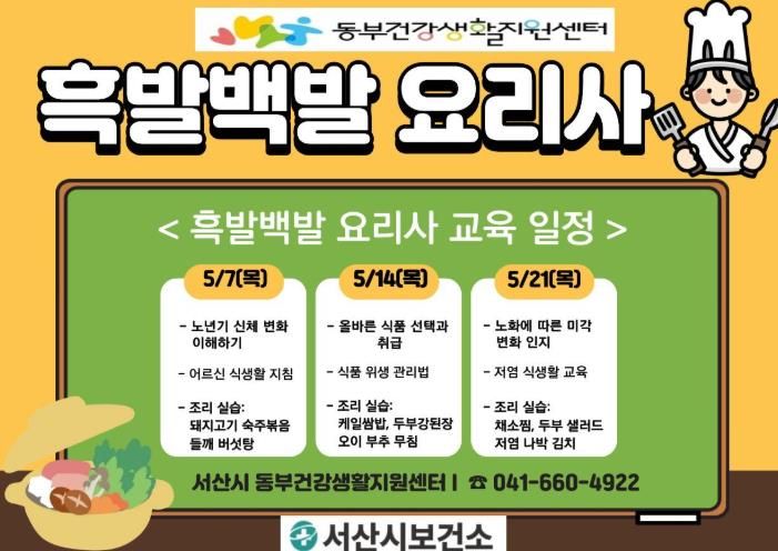 한방통신사 신태공 기자 | 서산시 보건소 동부건강생활지원센터에서 60세 이상 남성어르신을 대상으로 건강한 식생활 실천과 자가 건강관리 능력 향상을 위해 '흑발백발 요리사' 프로그램 대상자를 모집한다고 밝혔다.