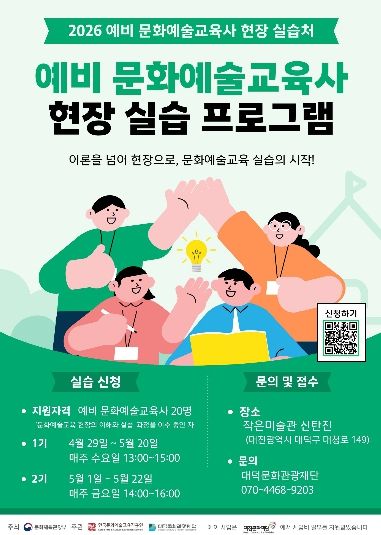 신청은 4월 28일까지 가능하며, 문화예술교육사 2급 자격과정 이수자 또는 ‘문화예술교육 현장의 이해와 실습’ 교과목 수강자를 대상으로 한다. 접수는 포스터 내 QR코드를 통해 네이버폼으로 진행된다.