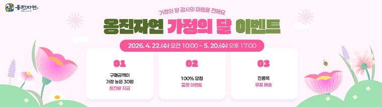 한방통신사 신유철기자 기자 | 옹진군은 5월 가정의 달을 맞아 지역 특산물 온라인 판로 확대와 옹진자연몰 이용 활성화를 위해 ‘2026년 옹진자연 가정의 달 맞이 이벤트’를 오는 4월 22일부터 5월 20일까지 총 29일간 운영한다고 밝혔다.