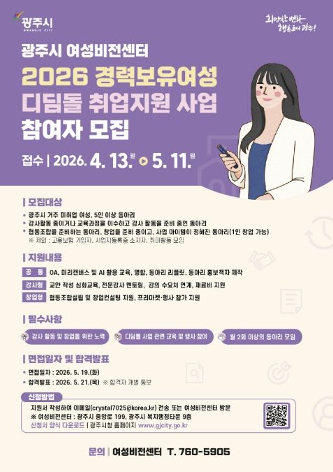 한방통신사 신유철기자 기자 | 광주시는 지역 내 경력보유여성의 사회 재진출과 취업 역량 강화를 위해 ‘2026 경력보유여성 디딤돌 취업 지원 사업’ 참여자를 오는 5월 11일까지 모집한다고 22일 밝혔다.