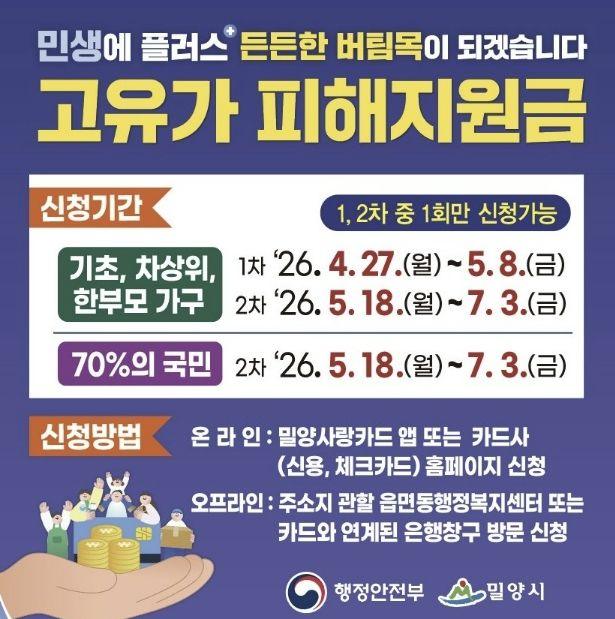 밀양시 관계자는 “시민들이 혼선 없이 지원금을 신청하고 사용할 수 있도록 전담 콜센터 운영 등 다양한 안내 채널을 가동하고 있다”며 “이번 지원이 고유가로 힘든 시기를 겪고 있는 시민들에게 실질적인 도움이 되길 바란다”고 말했다.