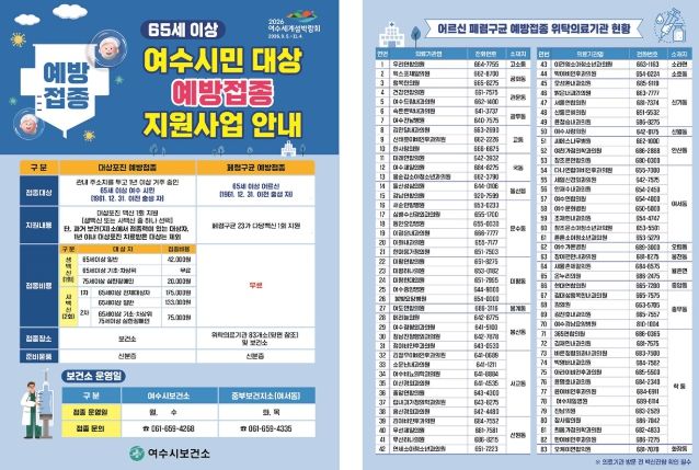 한방통신사 신다은기자 기자 | 여수시는 65세 이상(1961. 12. 31. 이전 출생자) 여수 시민을 대상으로 폐렴구균 및 대상포진 예방접종 비용을 지원한다고 밝혔다.