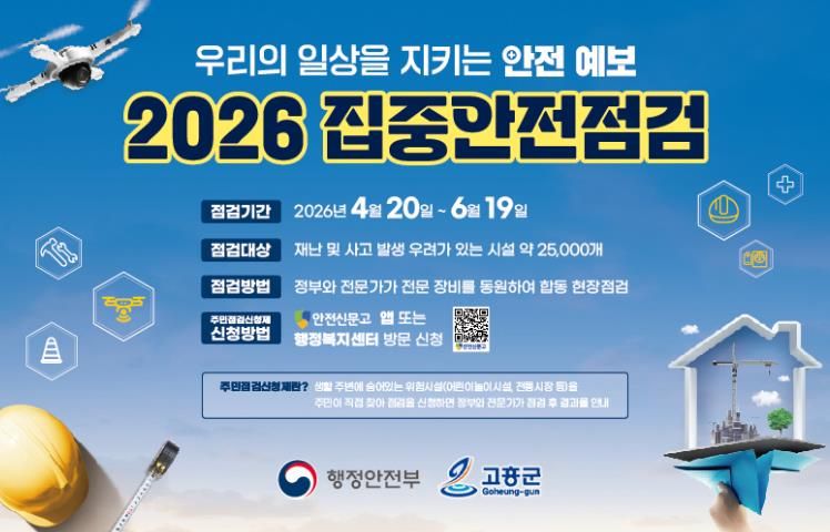 한방통신사 신다은기자 기자 | 고흥군은 재난과 안전사고 예방을 위해 4월 20일부터 6월 19일까지 2개월간 ‘2026년 집중안전점검’을 실시한다고 밝혔다.