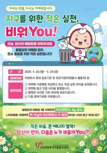 의정부시자원봉사센터 정진선 센터장은“일상에서 쉽게 실천할 수 있는 작은 행동들이 모여 큰 변화를 만든다.”며,“이번 캠페인을 통해 많은 시민들이 탄소 저감 활동에 관심을 가지고 적극적으로 참여하길 기대한다.”고 전했다.