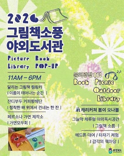 조미애 충북도 문화예술산업과장은 “이번 주말 도청 문화광장 815에서 펼쳐지는 책과 예술의 만남인 그림책 소풍 뿐만 아니라 다채로운 문화 행사가 많이 준비된 만큼 많은 도민께서 도청을 방문해 따뜻한 봄날의 정취를 만끽하시길 바란다”고 전했다.