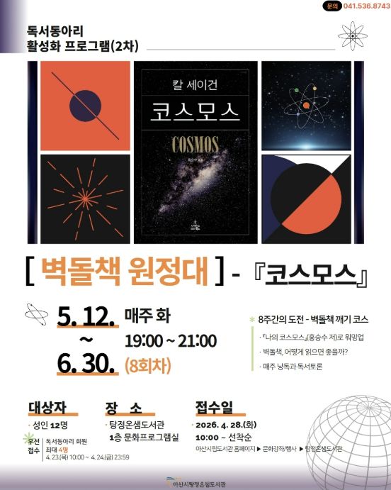 한방통신사 신태공 기자 | 아산시 탕정온샘도서관이 오는 5월부터 ‘벽돌책 원정대 - 『코스모스』 함께 읽기’ 프로그램을 신규 운영한다.