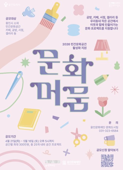 한방통신사 신유철기자 기자 | 용인문화재단은 오는 5월 16일까지 ‘민간문화공간 활성화 지원사업 '문화머뭄'’의 참여 공간을 모집한다고 밝혔다. 지난해 25개소 공간에서 203회의 프로그램을 운영하며 2,101명의 시민 참여를 이끌어낸 ‘문화머뭄’ 사업은 올해 재단 자체 재원을 매칭하여 총 25개소의 민간문화공간을 선정하고, 공간별 최대 300만 원까지 프로젝트 운영비를 지원할 예정이다.