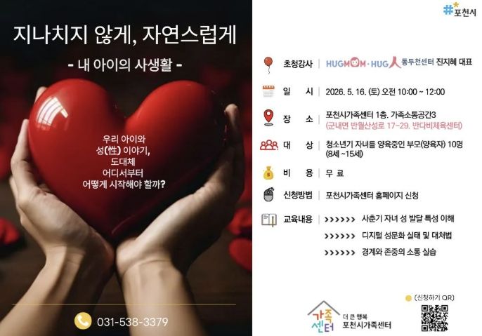 한방통신사 신유철기자 기자 | 포천시 직영 더 큰 행복 포천시가족센터는 오는 21일부터 사춘기 자녀를 둔 양육자를 대상으로 부모 교육 프로그램 ‘지나치지 않게, 자연스럽게’의 참여자를 모집한다. 이번 교육은 5월 16일 오전, 포천시가족센터 가족소통공간(반다비체육센터 1층)에서 대면 강의로 진행된다.