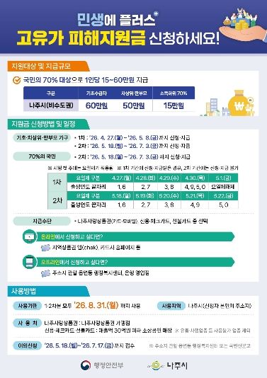 강상구 나주시장 권한대행은 “중동전쟁으로 인한 에너지 위기로 인해 어려움을 겪는 시민들이 이번 지원금을 통해 생활 안정에 도움이 되길 바란다”며 “기한 내 사용을 통해 지역경제 활성화에도 기여해 주시길 당부드린다”고 밝혔다.