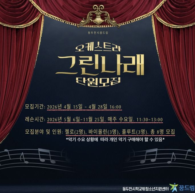 한방통신사 신유철기자 기자 | 동두천시학교밖청소년지원센터는 2026년을 맞아 학교 밖 청소년을 대상으로 ‘그린나래 오케스트라’ 신규 단원을 모집한다고 밝혔다.