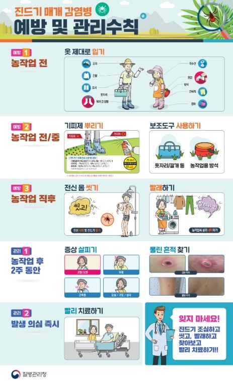 진드기 매개 감염병 예방 수칙으로는 ▲야외 활동 시 긴 소매, 긴 바지, 모자, 장갑, 장화 등을 착용하여 피부 노출 최소화 하기 ▲기피제 사용하기 ▲휴식 시 돗자리 사용하기 ▲ 야외 활동 후 즉시 샤워 및 세탁하기 등이 있다.