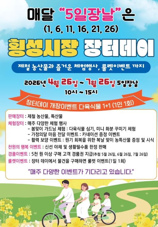 한방통신사 양호선기자 기자 | 횡성군이 전통시장 내 고객 유입을 촉진하고 지역 경제에 활력을 불어넣기 위해 오는 4월 26일부터 7월 26일까지 ‘2026 횡성전통시장 장터데이’ 행사를 개최한다.