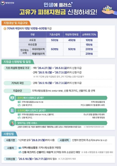 고유가 피해지원금은 소득계층별로 차등 지급되며, 기초생활수급자는 60만 원, 차상위계층 및 한부모가정은 50만 원, 소득하위 70% 군민은 25만 원을 지원받게 된다.