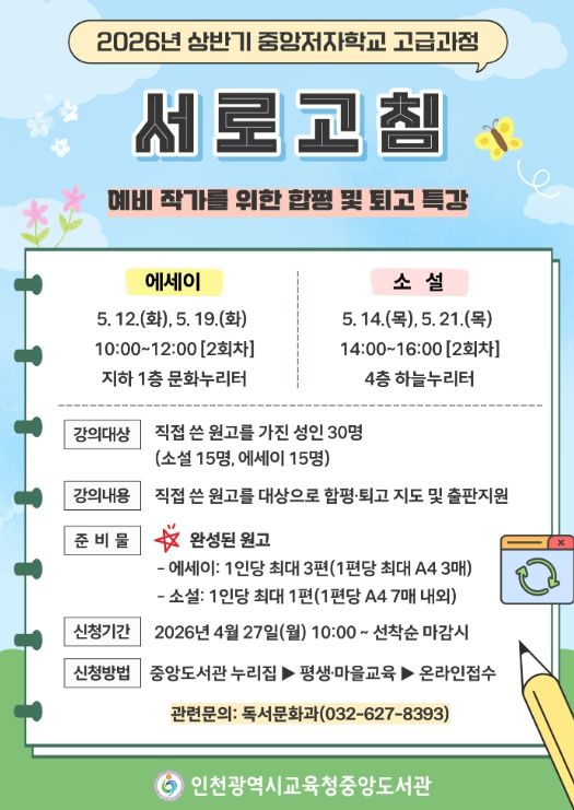 한방통신사 신유철기자 기자 | 인천광역시교육청중앙도서관은 4월 27일부터 예비 작가를 위한 ‘중앙저자학교 고급과정’ 참여자를 모집한다.
