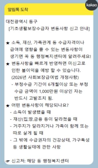 구는 생계급여 수급자 중 휴대전화 보유 가구를 대상으로 연 2회(4월, 10월) 카카오톡 알림톡을 정기 발송해 신고 의무 사항을 전달하고, 변동사항 발생 시 즉시 신고로 이어질 수 있도록 안내할 계획이다.