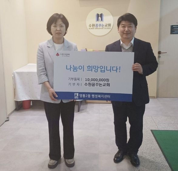 한방통신사 신유철기자 기자 | 수원시 영통구 영통2동은 지난 23일 수원꿈꾸는교회가 지역사회 내 취약계층 지원을 위해 교인들과 함께 모금한 사랑의 성금 1천만원을 영통2동 행정복지센터에 기부했다고 밝혔다.