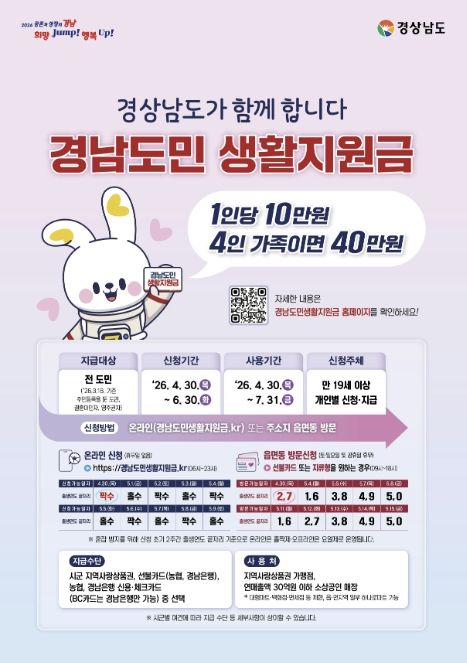 경남도민 생활지원금은 전 군민(2026년 3월 18일 주민등록 기준)을 대상으로 4월 30일부터 6월 30일까지 지급된다. 지원금액은 1인당 10만 원이며, 지급수단은 창녕사랑상품권, 신용·체크카드(농협-경남은행), 선불카드 등이다.