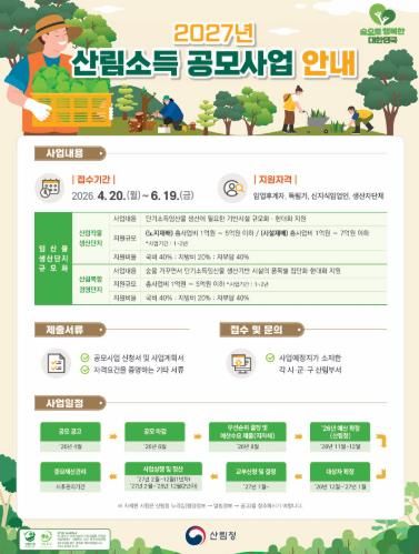 공모 대상은 산림작물생산단지와 산림복합경영단지 조성 사업으로, 총사업비 258억 원(국비 103억 원, 지방비 52억 원, 자부담 103억 원)이 투입된다.