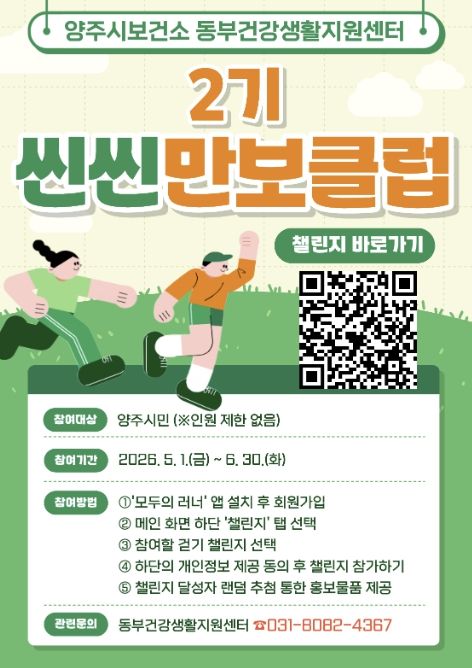 한방통신사 신유철기자 기자 | 양주시보건소 동부 건강생활지원센터에서 지역 주민의 건강생활실천율 향상과 비만율 개선을 위해 ‘2026년도 씬씬 만보클럽 2기’ 참여자를 모집한다.