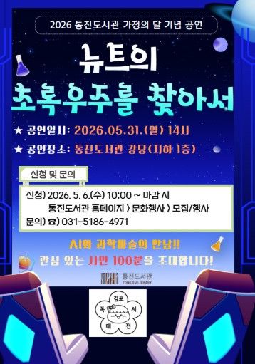 한방통신사 신유철기자 기자 | 김포시 통진도서관이 가정의 달을 맞아 온 가족이 함께 즐길 수 있는 공연 '뉴트의 초록우주를 찾아서'를 오는 5월 31일 오후 2시 통진도서관 강당에서 개최한다.