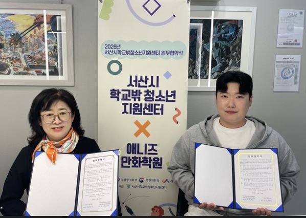 한방통신사 신태공 기자 | 충청남도 서산시학교밖청소년지원센터는 4월 23일, 애니즈 만화학원과 학교 밖 청소년의 자기계발 및 진로 탐색 지원을 위한 업무 협약(MOU)을 체결했다.