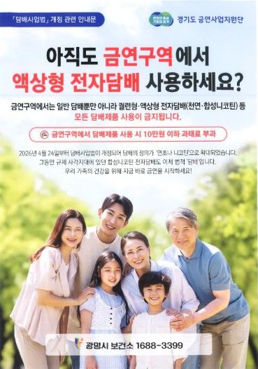 한방통신사 신유철기자 기자 | 광명시 보건소는 시민 건강을 증진하고 간접흡연 피해를 막기 위해 오는 5월 15일까지 ‘2026년 담배 정의 확대에 따른 금연구역 합동 점검·단속’을 한다.
