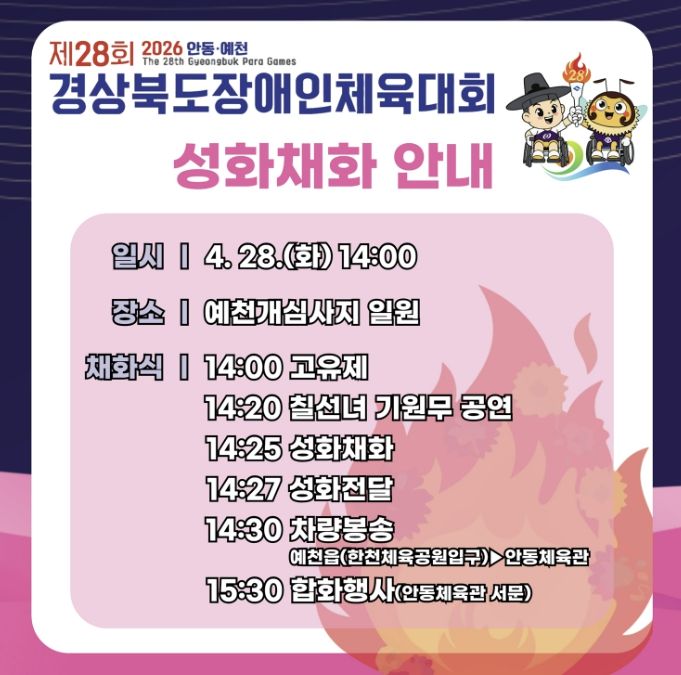 한편, 제28회 경상북도장애인체육대회는 오는 4월 29일부터 4월 30일까지 이틀간 안동시 일원 경기장에서 개최되며, 도내 시·군 선수단이 참가해 각종 종목에서 뜨거운 열전을 이어갈 예정이다.