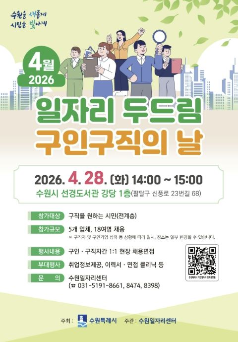 한방통신사 신유철기자 기자 | 수원특례시는 4월 28일 오후 2시부터 3시까지 선경도서관 강당에서 ‘4월 일자리 두드림 구인·구직의 날’을 개최한다.