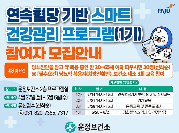 한방통신사 신유철기자 기자 | 파주시 운정보건소는 심뇌혈관질환 예방관리사업의 일환으로 ‘연속혈당 기반 스마트 건강관리 프로그램’참여자를 오는 27일부터 10일간 모집한다.