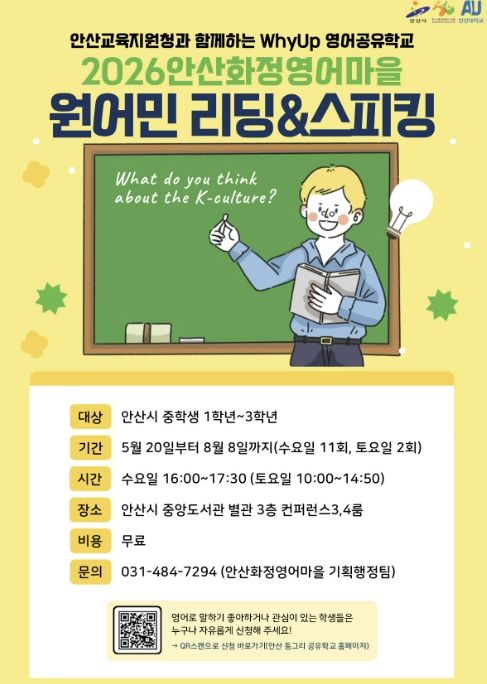 이번 프로그램은 ‘안산 동그리 공유학교’를 기반으로 운영되는 WhyUp 영어공유학교 사업의 일환으로 추진된다. 참가 신청은 27일 오전 9시부터 오는 30일 오후 6시까지 경기공유학교 누리집에서 온라인으로 하면 된다.