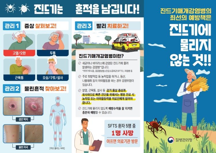 진드기매개 감염병은 세균이나 바이러스에 감염된 진드기에 물려 발생하는 감염병으로, 쯔쯔가무시증, 중증열성혈소판감소증후군(SFTS) 등이 있다. 특히, SFTS는 2013년 이후 국내 누적 환자 2,345명 중 422명이 사망하여 치명률이 18.0%에 달하며, 현재 백신과 치료제가 없어 예방 수칙 준수가 최선이다. 또한, 60세 이상 고령층이 전체 환자의 81.8%를 차지하는 만큼 어르신이 있는 가정에서는 특별한 주의가 필요하다.