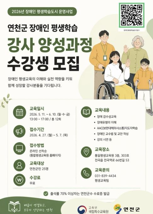 한방통신사 신유철기자 기자 | 연천군은 교육부 국립특수교육원이 주관하는 '2026년 장애인 평생학습도시 운영 지원사업' 공모에 선정됨에 따라 장애인 평생교육 현장형 강사 양성 과정을 운영한다.