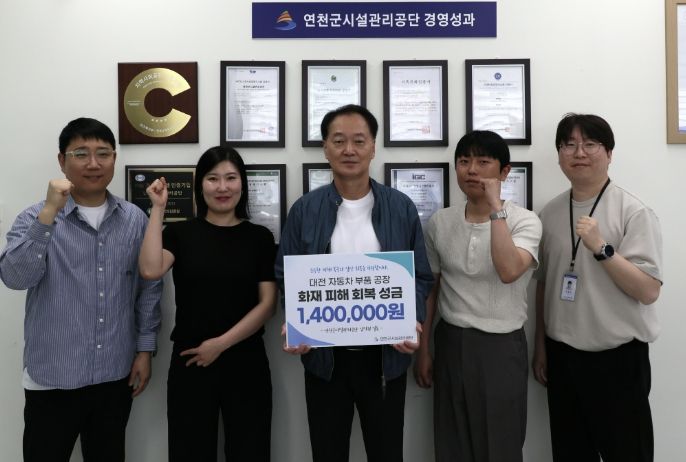 한방통신사 신유철기자 기자 | 연천군시설관리공단은 지난 23일 대전 자동차 부품 공장 화재로 피해를 입은 근로자 및 이재민 지원을 위한 성금 1,400,000원을 대한적십자사에 전달했다고 밝혔다.
