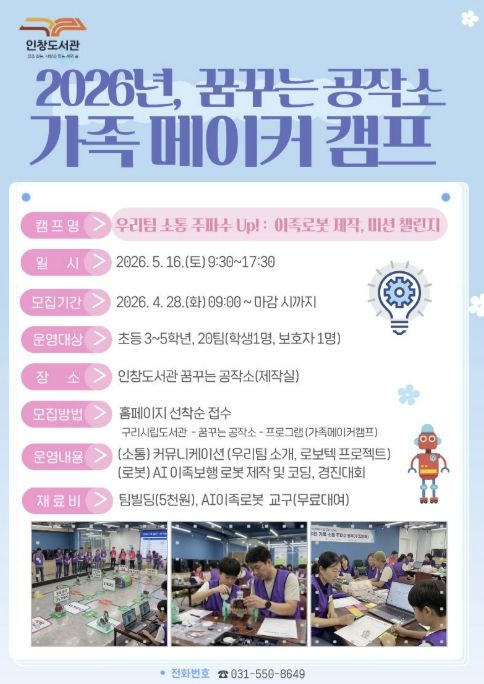 한방통신사 신유철기자 기자 | 구리시 인창도서관‘꿈꾸는 공작소’는 오는 5월 16일 초등학생 자녀와 보호자가 함께 참여해 가족 간 유대감을 높이고 인공지능을 체험하는 '우리 팀 소통 주파수 Up! : 이족로봇 제작, 미션 챌린지' 가족 메이커 캠프를 운영한다고 밝혔다.