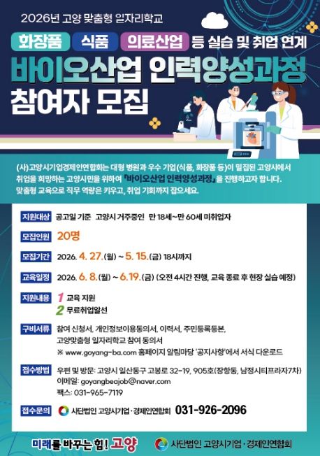 한방통신사 신유철기자 기자 | 고양특례시는 2026년 고양맞춤형 일자리학교 공모사업 중 ‘바이오산업 인력 양성과정’의 참여자를 모집한다.