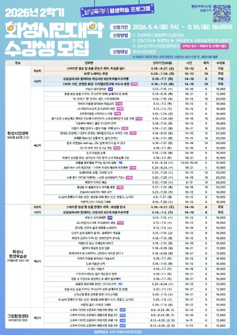 한방통신사 신유철기자 기자 | 화성특례시는 2026년 화성시민대학 2학기 수강생을 오는 5월 4일부터 5월 10일까지 선착순으로 모집한다고 밝혔다.
