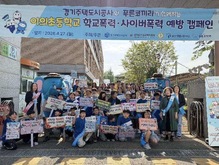이날 캠페인에는 GH 임직원을 비롯해 수원시교육청 장학사, 이의초 교직원 및 학부모회, 학생, 푸른나무재단 관계자가 함께했다. 참가자들은 등교하는 학생들에게 사이버폭력 예방 스티커와 기념품을 나눠주며 비폭력 문화 확산을 위한 메시지를 전달했다.