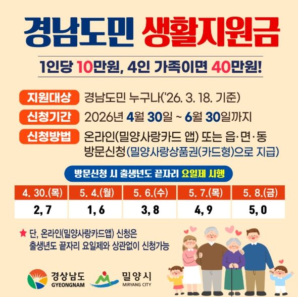 지원 대상은 2026년 3월 18일 기준 밀양시에 주민등록을 둔 시민이며, 1인당 10만원이 지급된다.